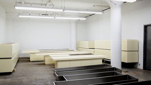 Wayne: I’d like to begin with form and then move into a discussion of industrial production and its relation to human activity. Your exhibition at Team this spring featured a suite of basins encased in maple and (MDF). The sculptures undoubtedly have a relatively monumental size and rigid structure in relation to the gallery space. Would you say that your primary visual vocabulary is minimalist?